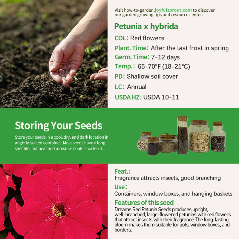 Dreams Red Petunia Seeds produces upright, well-branched, large-flowered petunias. These tender perennials are often grown as annuals. Their large, vibrant red flowers, measuring 3.25 to 3.5 inches in diameter, have a rich fragrance that attracts bees, butterflies, and hummingbirds. Their blooms last from spring to summer, lasting a long time. They are suitable for containers, window boxes, hanging baskets, and as borders or groundcovers in flower beds and borders. They are easy to care for and grow in full sun to light shade. They are adaptable to poor soil conditions, are virtually pest- and disease-resistant, and are deer-resistant.