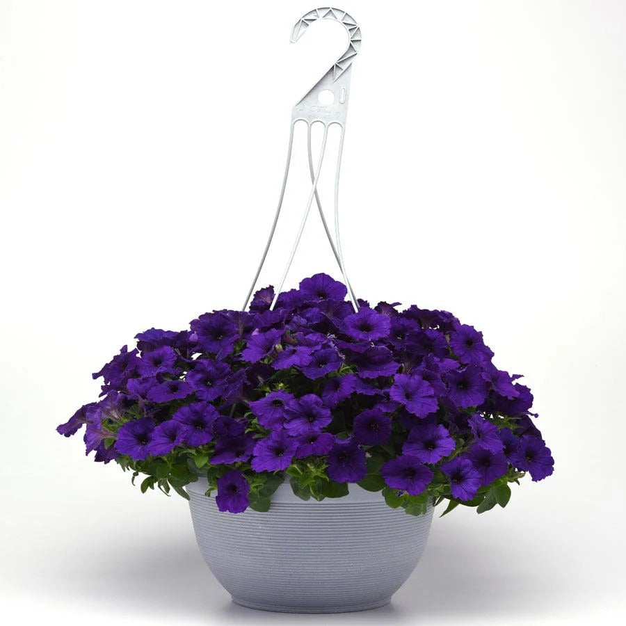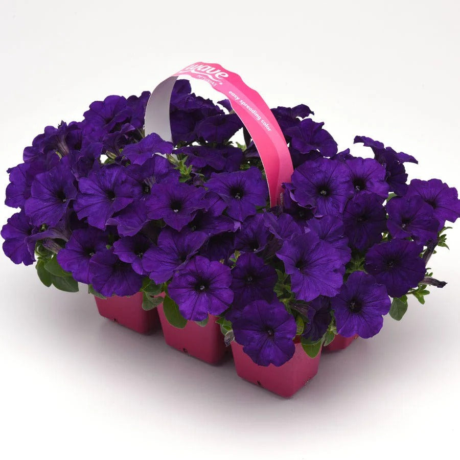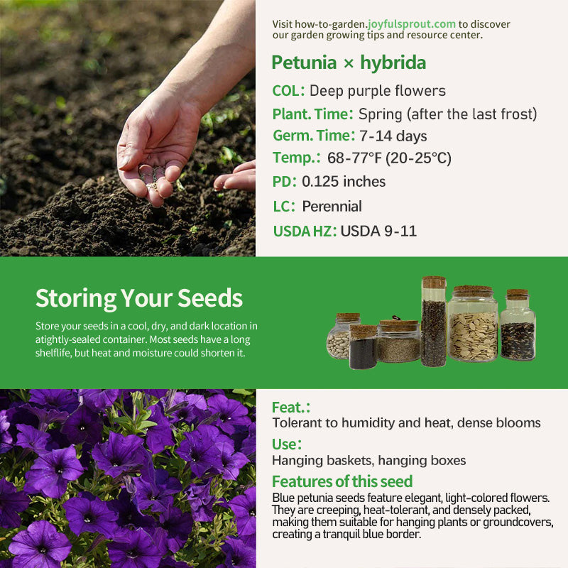 E3 Easy Wave Blue petunia seeds, featuring fresh, elegant flowers, are ideal for balancing garden color. The plant exhibits a classic creeping, hanging pattern, with strong branching ability and flexible, resilient stems. It can naturally hang to 30-40 inches or spread along the ground to form a dense groundcover. Its dark green, lanceolate leaves are smooth-edged, dense yet tidy, maintaining a vibrant green year-round. The single, trumpet-shaped flowers are a pure sky blue or lavender color without any variegation, measuring approximately 2-2.5 inches in diameter. The dense blooms bloom continuously from late spring to early fall, their color becoming even more vibrant in sunlight.