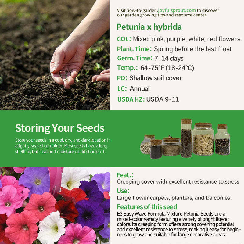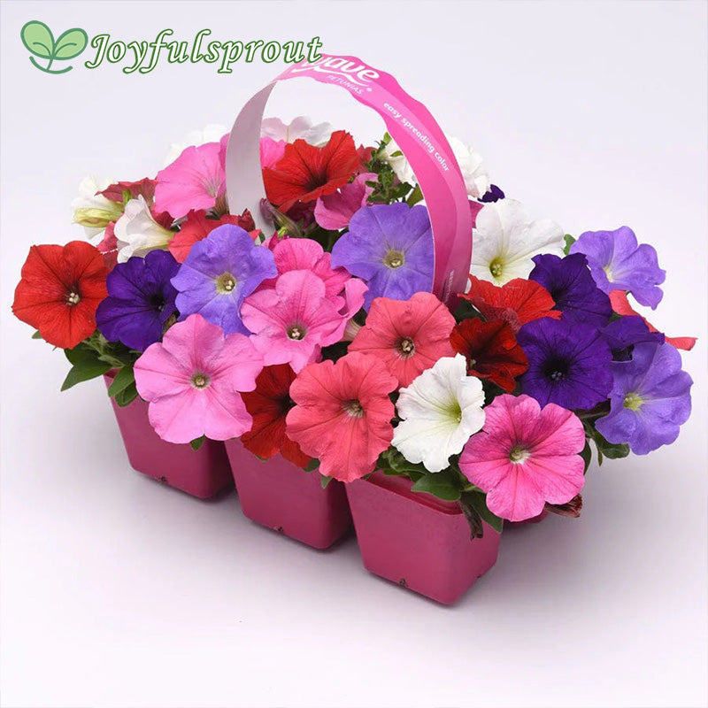 E3 Easy Wave Formula Mixture Petunia Seeds are a carefully blended assortment of petunia seeds, featuring a variety of bright and harmonious flower colors, including pink, purple, white, and red. Once planted, they create a colorful and layered landscape effect. Their core strength lies in their creeping form, well-spread branches, and excellent covering ability. Once planted, they can quickly fill pots, planters, or the ground, forming a dense carpet of flowers. This variety has been bred for significantly improved resistance, being sun- and drought-tolerant, and also able to tolerate low temperatures to a certain degree, allowing them to bloom reliably in spring and autumn. Their flowering period is long and continuous, lasting from spring sowing until just before frost in autumn. Whether creating a small balcony garden for home gardeners or creating large-scale flower borders for municipal greening or commercial landscapes, they are a perfect fit.