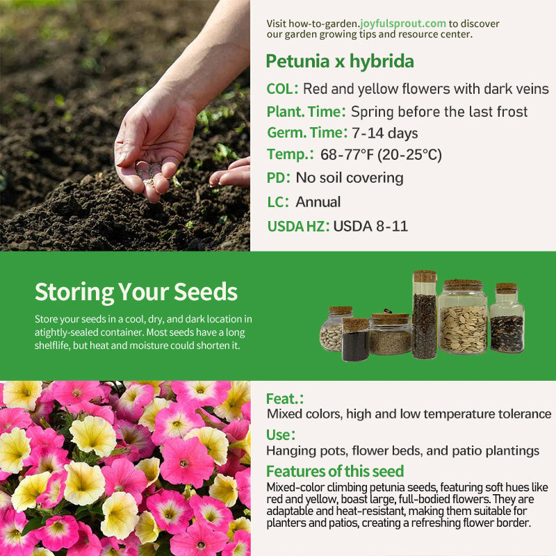 E3 Easy Wave Sweet Taffy Mix petunia seeds are a climbing variety featuring a soft, mixed color palette. The seeds contain a variety of gentle hues, including red and yellow. When mixed, the flowers bloom in a staggered pattern, resembling a spilled "taffy palette" and creating a refreshing and soothing visual experience. The plants inherit the excellent characteristics of the E3 series, with strong branching, flexible vines that are easy to shape, and rapid growth, forming dense clusters of flowers shortly after sowing. They are highly adaptable, tolerant of both mild low temperatures (short-term survival around 5°C) and summer temperatures exceeding 35°C. They are also moderately demanding in soil, and can be planted in ordinary garden soil mixed with leaf mold. They produce plump flowers, blooming from late spring to late autumn, with a steady supply and little drop.