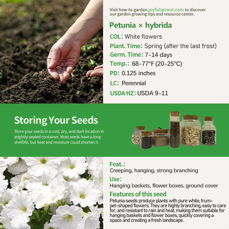 E3 Easy Wave White Petunia seeds are ideal for creating a fresh, minimalist landscape. They produce plants with excellent creeping growth characteristics and strong branching ability, naturally forming a full-bodied shape without pinching, and can quickly cover the edges of pots or the ground. The leaves are oval, dark green, and light yet disease-resistant, making them less susceptible to yellowing and pests. The flowers are a classic trumpet shape, with pure white petals and smooth edges, approximately 2-3 inches in diameter. The flowers are abundant, blooming continuously from late spring to early fall, and quickly regain their full height even after brief rainfall.