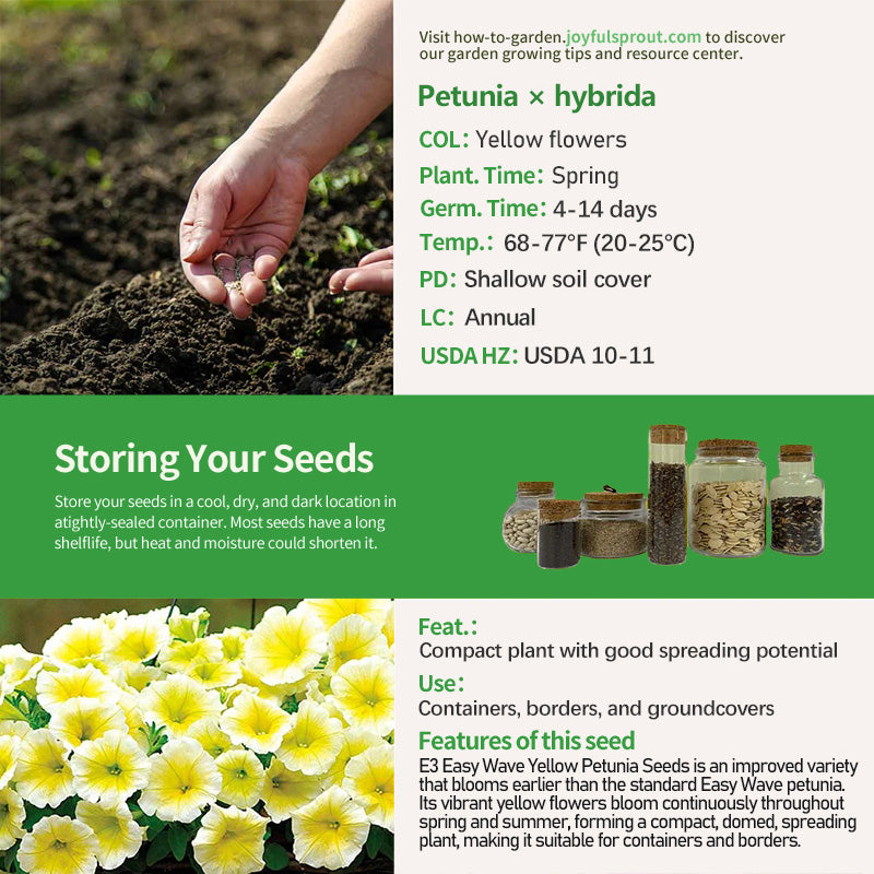E3 Easy Wave Yellow Petunia Seeds is an upgraded and improved version of the series. Its most notable feature is its early blooming of vibrant yellow flowers, which blooms earlier than standard Easy Wave petunias, allowing you to enjoy the blooming season earlier. Its delicately scented flowers bloom continuously throughout spring and summer, attracting butterflies and hummingbirds. The plant forms a regular domed shape, compact yet full, with a moderate spreading habit, preventing uncontrolled growth. Planted in a container, its branches drape gracefully, creating a beautiful hanging feature. Its neat shape and vibrant flowers create a clear border in borders. It has low soil requirements and thrives in poor soil. It's easy to care for and is ideal for creating a colorful garden.