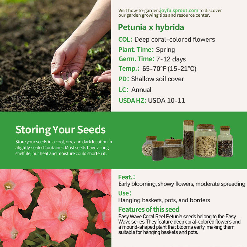 Easy Wave Coral Reef Petunia seeds belong to the Easy Wave series, which features a more mound-shaped plant than the classic Wave series. They are slightly less spreading, require less plant growth regulators, and bloom earlier. Their flowers are deep coral and bloom continuously from late spring to summer. They have a spreading growth habit, reaching a height of 6-12 inches and a spread of 30-39 inches. They prefer full sun and grow well in average to moderately moist, well-drained soil. They are suitable for containers and can also be used in flower beds and borders.