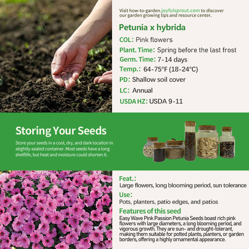 Easy Wave Pink Passion Petunia Seeds feature a rich, pure pink color as their core color. The flowers reach a diameter of 3-4 inches, and their expansive, elegant blooms are highly attractive when in full bloom. This vigorous, multi-branched variety requires no topping to achieve a compact, full-bodied plant. They produce numerous flowers, with each plant producing dozens simultaneously, and their blooming period lasts from spring to autumn, with new flowers continuously emerging. They require high light levels, with their vibrant colors appearing more vibrantly in ample sunlight. They are also drought- and sun-tolerant, and can be prevented from wilting during summer heat with regular watering. Whether potted on a balcony or patio, or planted in a garden planter or along the edge of a flower bed, their vibrant pink blooms create a striking visual focal point. They can also be combined with other colorful flowers to create a fresh and romantic landscape.