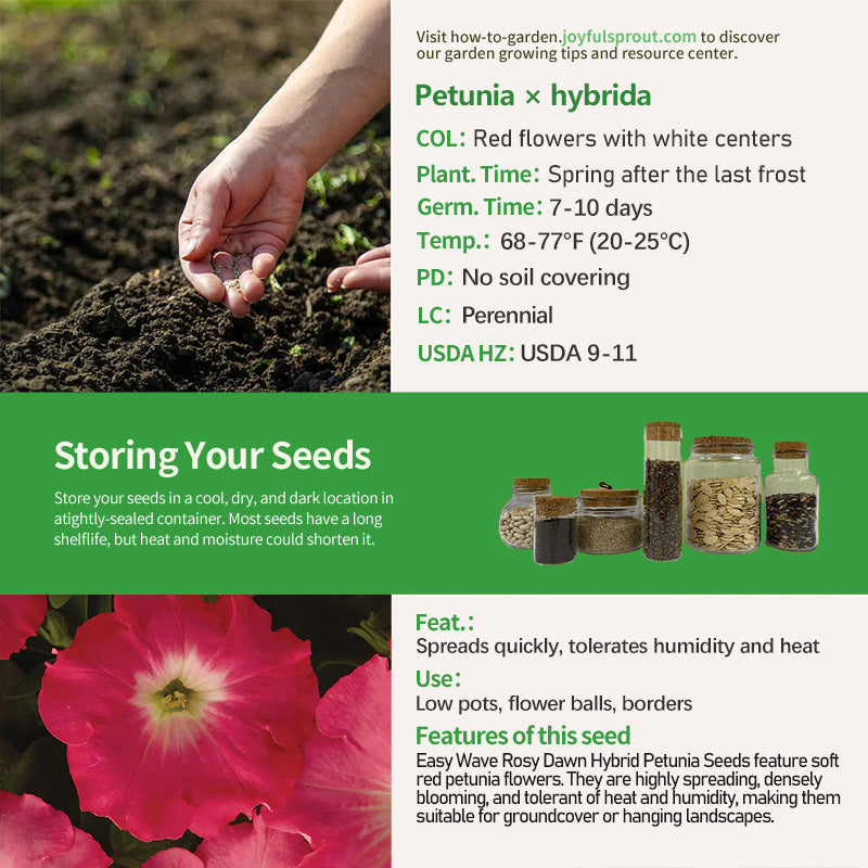 Easy Wave Rosy Dawn Hybrid Petunia Seeds stand out with their distinctive red color. The petals have a subtle blush around the edges, creating a rich, lush color that resembles a rosy morning glow. Continuing the excellent spread of the Easy Wave series, the plants reach a height of 6-10 inches and can spread 20-24 inches horizontally, making them a great choice for quickly covering groundcover or container surfaces. Their thick, dark green leaves tolerate heat and humidity, resisting yellowing during heavy summer rains. The flowers are densely blooming, with new blooms continuously appearing from late spring to early fall.