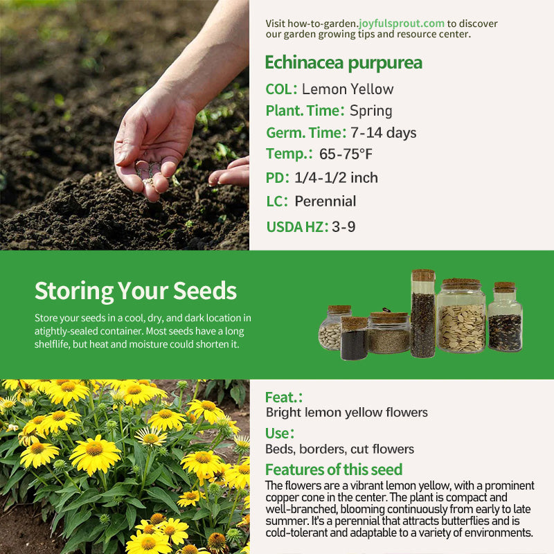 In a quiet small town, Sarah wanted to add a touch of color to her yard. She ordered Echinacea Sombrero Lemon Yellow Improved Coneflower seeds online. After receiving the seeds, she carefully sowed them in her yard. Soon, the seeds germinated, and the plant flourished, becoming compact and sturdy. When the first lemon-yellow flower bloomed, Sarah was stunned by the vibrant color. Since then, the flowers have continued to bloom from early to late summer. The golden blossoms contrast with the copper cone in the center, bringing endless vitality to the yard and attracting many butterflies. Sarah finds joy in spending every day among the flowers.