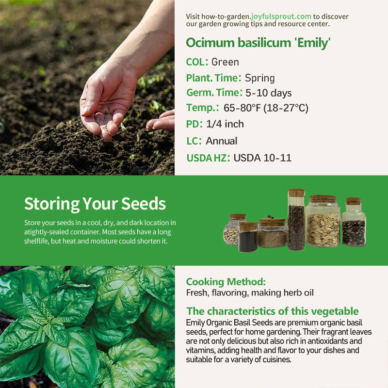 Emily Organic Basil Seeds bring you an authentic organic basil experience. Growing strong in the warm sunshine, these seeds release a rich aroma that awakens your taste buds. Emily varieties of basil are not only delicious but also rich in antioxidants and vitamin K, which help reduce inflammation and improve heart health. Imagine growing and harvesting fresh basil from your own garden, adding it to homemade tomato sauces or salads for a refreshing taste and nutritional boost. Emily Organic Basil is not only a helpful kitchen tool but also an ideal choice for healthy eating, making every bite a natural delight.
