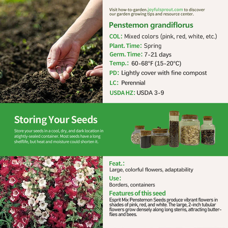Esprit Mix Penstemon Seeds is a perennial herb (it can be grown as an annual in less cold-hardy zones). If sown early, it blooms in its first year. The flowers range in color from pink to red to white, adding to its unique charm. The 2-inch tubular flowers are tightly packed on long, persistent stems, and the plant reaches 24 to 30 inches in height when in bloom. Native to the Great Plains, it adapts to dry soils, requires minimal fertility, and tolerates heat and drought. Silvery-green leaves form a neat rosette beneath the flowers. It is an evergreen in mild climates and performs well in containers or in sunny borders.