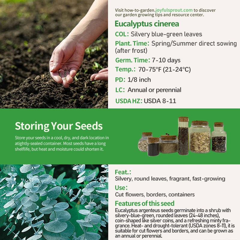 Eucalyptus argenteus seeds germinate into a shrub with silvery-blue-green, rounded leaves 2-3 inches in diameter, covered with a waxy coating that gives it a metallic sheen in sunlight. The plant grows rapidly (reaching up to 36 inches in its first year) and requires full sun and well-drained soil. As a short-lived perennial (USDA zones 8-11), its leaves can be used as fresh cut or dried flowers, and their fragrance is more pronounced in humid conditions. Germination occurs 7-10 days after sowing. Cover with 1/8 inch of soil, and keep the soil slightly moist but not waterlogged during the growing season. This variety is easily propagated from cuttings and pairs well with purple or blue flowers for a striking contrasting color scheme.