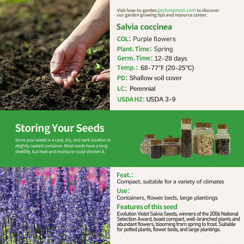Salvia grown from "Evolution Violet" seeds offers remarkable advantages: compact, well-branched plants and abundant blooms. Its purple flowers bloom continuously from spring until frost. It is highly adaptable and can be grown in pots for small displays in living rooms and balconies, or planted in large flower beds and parks, creating a romantic sea of purple flowers. It thrives in dry, hot conditions and is a relatively easy-to-care-for plant.