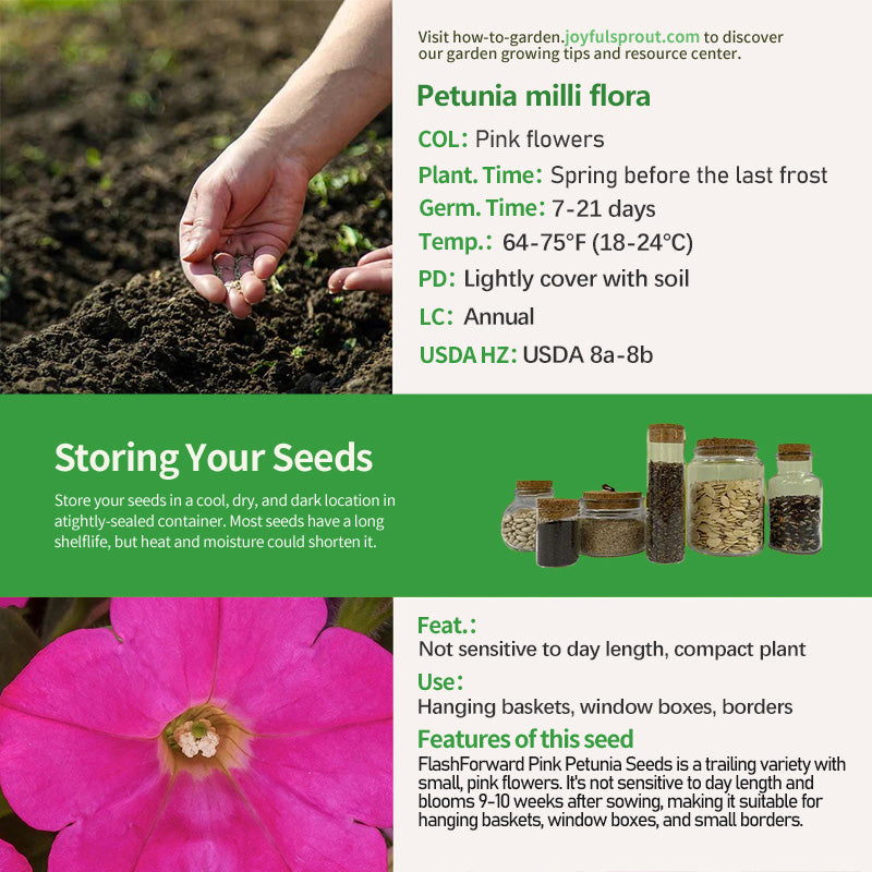 FlashForward Pink Petunia Seeds produces trailing petunias with slender, flexible branches. The flowers are small, delicate, bright pink, with trumpet-shaped petals and a diameter of approximately 1-1.5 inches. It's not sensitive to day length and blooms in just 9-10 weeks from sowing, even in short-day conditions. The numerous flowers attract bees, butterflies, and other insects. The plant grows quickly, maintaining a compact, neat shape without spreading excessively. It's ideal for hanging baskets, creating a romantic cascade of pink flowers, window boxes, and even small borders, where it adds a natural touch. It also creates a unique edge plant in small borders.