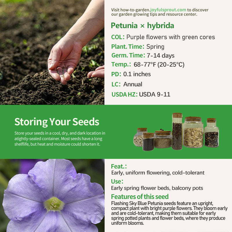 Flashing Sky Blue Petunia seeds are distinguished by their early and uniform flowering. The plants are upright, compact, and grow rapidly, blooming 1-2 weeks earlier than typical petunias. This uniform flowering pattern allows plants planted in the same batch to bloom almost simultaneously, eliminating an uneven landscape effect. The flowers are a bright purple, fresh and elegant, measuring approximately 3 inches in diameter. The petals are soft and have a gentle sheen in sunlight. They are exceptionally cold-tolerant, surviving even in low temperatures in early spring, without having to wait for warmer temperatures to bloom. This variety can grow in full sun or light to partial shade, adapting to a wide range of soils. Its flowering period lasts from early spring to autumn, with new branches and flowers continuously sprouting.