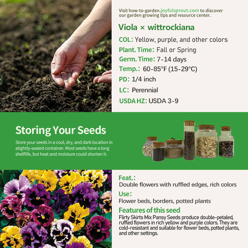 Flirty Skirts Mix Pansy Seeds are highly ornamental pansy seeds. Plants grown from sowing have double, ruffled flowers with rich, layered petals, resembling a flowing skirt. The vibrant color palette, encompassing a variety of hues, including yellow and purple, interweaves for a striking visual impact. The plants are cold-tolerant and thrive in cool climates. With a smooth sowing-to-flowering cycle, they create a romantic and sophisticated landscape for gardens, balconies, and other spaces. Whether creating a colorful block in a flower bed or adorning windowsills or desks, their unique flower shape and vibrant colors create a striking addition to any garden setting, adding natural beauty and vitality.