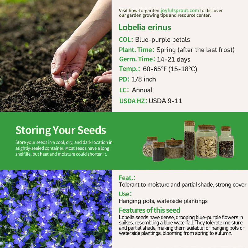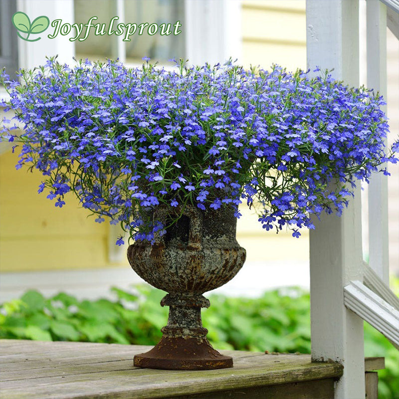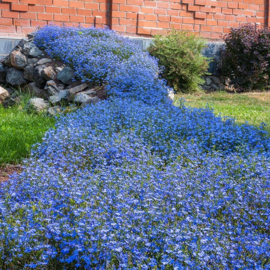 Plants grown from Fountain Blue Lobelia seeds are known for their densely packed blue-purple flowers, which cascade like a blue waterfall when in full bloom, earning them the name "Fountain Blue." The small, emerald green leaves create a striking contrast with the blue flowers. The plant grows 8-12 inches tall and has strong branching, making it suitable for hanging pots or hanging flower boxes. It tolerates moisture and partial shade, thriving near waterside areas or in the shade of trees. Its flowers bloom continuously from late spring to autumn, attracting butterflies and other pollinators. Whether hanging on a balcony or planted at the edge of a pond, the vibrant blue cascade adds a touch of natural charm, making it an ideal choice for water features or shade gardens.