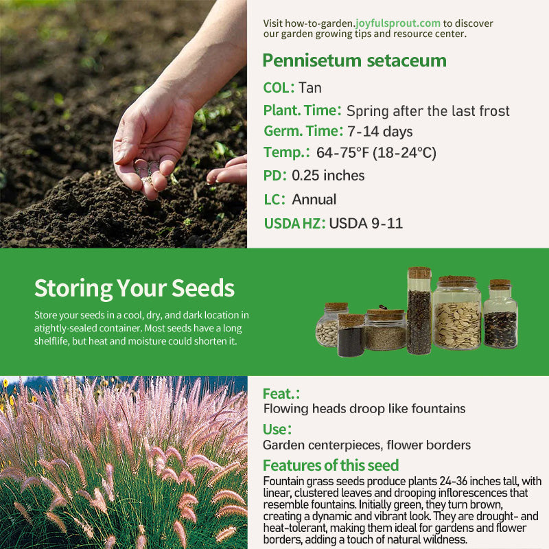 Fountain grass seeds are a key choice for creating a "dynamic garden." They produce plants that grow in a clumping pattern, 24-36 inches tall. Their leaves are slender, linear, dark green, glossy, and soft in texture, spreading outward from the base to form a natural, "fountain-like" curve. In early summer, panicles of light green inflorescences emerge, gradually turning brown as they mature. The inflorescences are 8-12 inches long, drooping gracefully, swaying like flowing water in the breeze, creating a strikingly dynamic aesthetic. This variety is highly adaptable, drought- and heat-tolerant, and tolerates poor soils. It grows best in full sun, requiring minimal watering and pruning, making maintenance low.