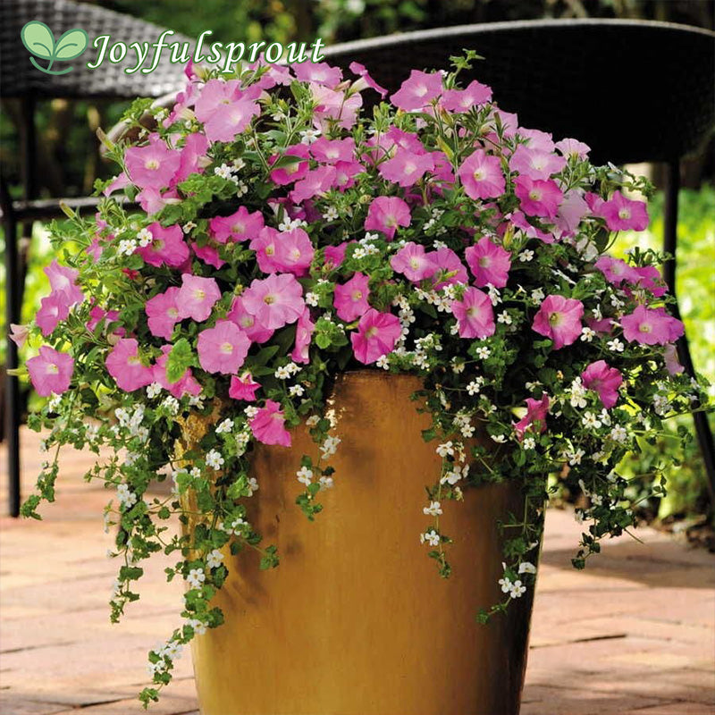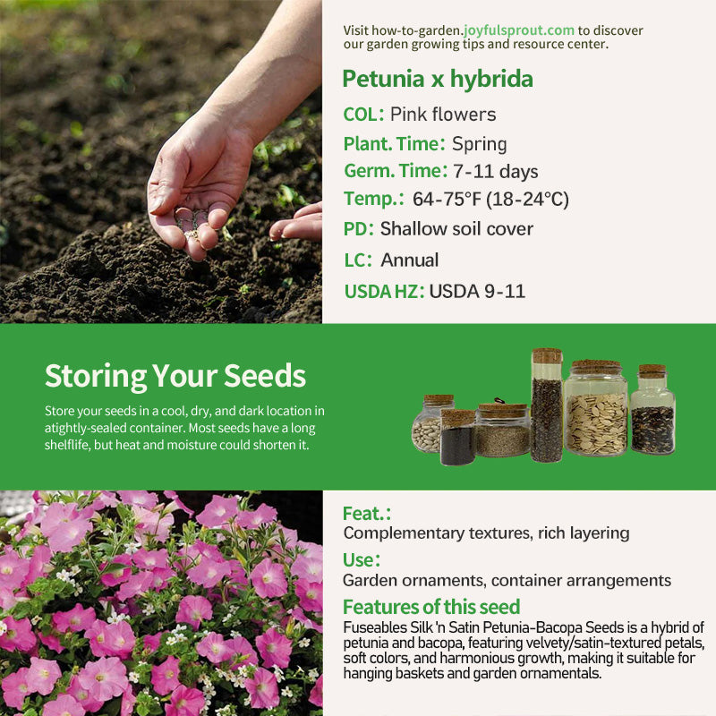 Fuseables Silk 'n Satin Petunia-Bacopa Seeds is a hybrid of petunia and bacopa, with harmonious growth habits that create a naturally harmonious landscape. The petunia's velvety petals offer a striking yet complementary texture, while the predominantly soft pink color creates a fresh and elegant overall palette without any jarring color clashes. The plant reaches a height of approximately 6-10 inches, with the petunia's slightly creeping branches and the bacopa's slender, drooping branches. When planted together, they create a "staggered" effect. They are highly adaptable and can grow in light shade or full sun, blooming from late spring to fall. They require minimal pruning and are easy to care for.