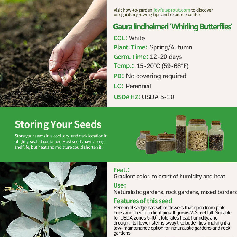 Perennial sedge grows 2-3 feet tall, with white flowers atop slender stems that open from pink buds and turn light pink as they mature. Its flowers sway in the breeze, resembling a fluttering butterfly. It is adaptable to USDA zones 5-10, preferring full sun and well-drained soil. It tolerates drought and poor soil conditions and can also thrive in hot and humid conditions. Its leaves are lanceolate with a slight blush in autumn. It can be propagated by sowing or dividing. The ideal temperature for germination is 15-20°C (62-76°F). No covering is required. Light pruning after flowering promotes branching and extends the blooming period into autumn. It is suitable for naturalistic gardens, rock gardens, or mixed flower borders, and pairs well with purple sage.