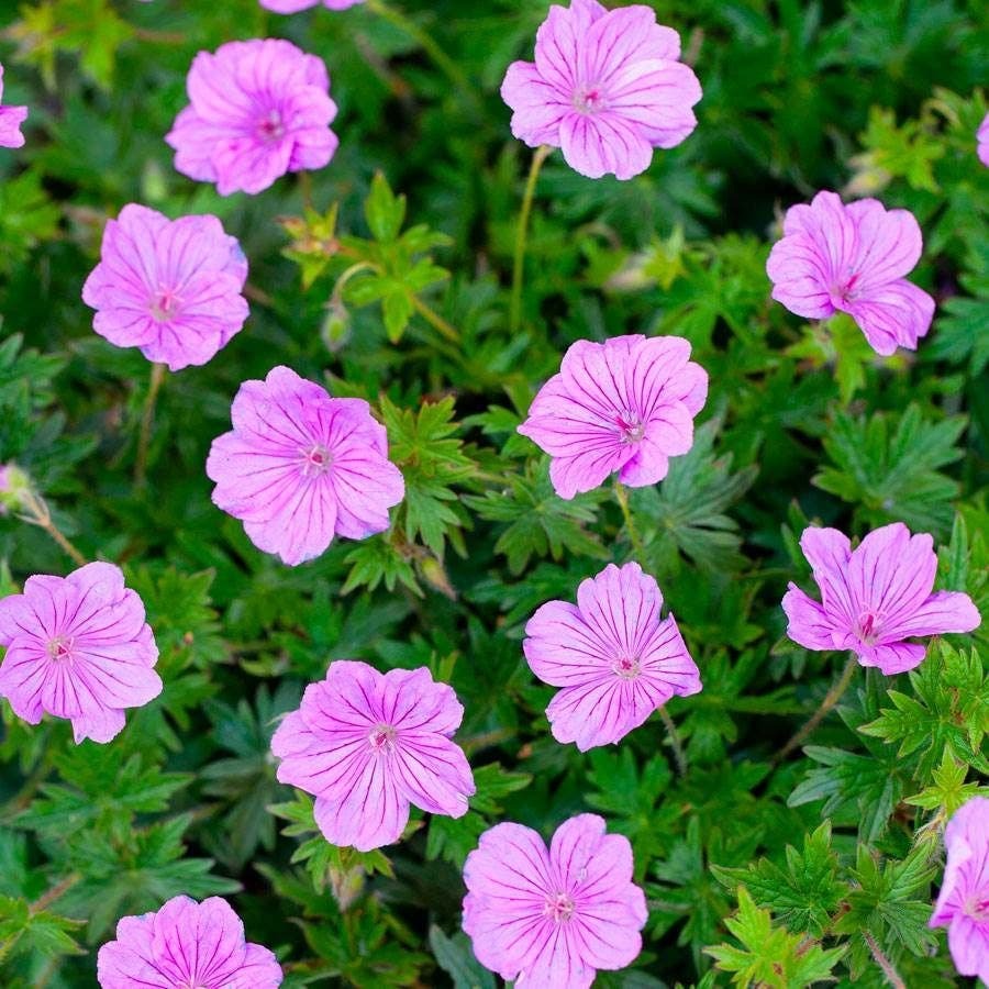 Geranium 'Blushing Turtle' is a garden star. As a perennial, it has an upright, rounded growth pattern and deeply lobed leaves, adding a unique texture. The flowers begin blooming in midsummer, with an attractive pink color and purple veins on each petal. The large flowers stand out from the plant. Its flowering period is long, lasting into autumn, with new blooms constantly appearing throughout the season. Butterflies are particularly attracted to its flowers, often flitting around them. This cultivar thrives well in full sun to partial shade, making it suitable for flower beds and borders, as well as for potted plants on terraces and patios.