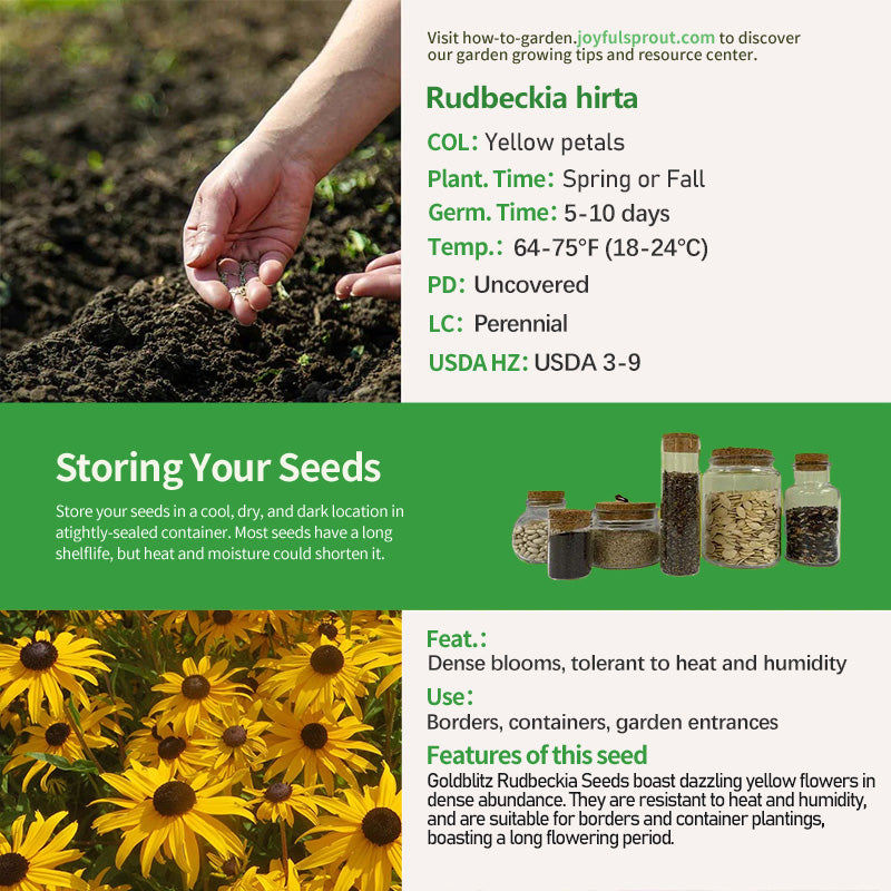 Goldblitz Rudbeckia is a high-yielding, disease-resistant rudbeckia. Plants grown from seed produce vibrant yellow flowers with a vibrant color, resembling "gold foil in the sun," instantly capturing the eye in the garden. Thick, rain-resistant petals surround a dark brown center, measuring approximately 2.5-3.5 inches in diameter. Flowers are densely distributed throughout the plant, blooming from the base to the tip. The plant reaches a compact height of 20-26 inches, boasting dark green, lanceolate leaves. It is highly disease-resistant, not susceptible to black spot and powdery mildew, and is particularly tolerant of heat and humidity. Its flowering period lasts from early summer to late autumn, and pruning spent flowers can encourage multiple blooms. Care is easy.Special Offers: