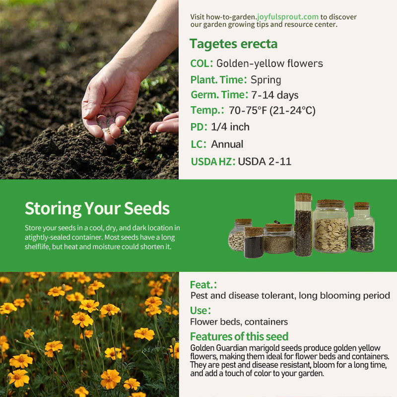 Golden Guardian marigold seeds are beloved for their golden yellow flowers, making them suitable for a variety of garden designs. These hardy plants are pest and disease resistant and can thrive in a wide range of soil conditions. Their long blooming period lasts throughout summer and fall, adding color to flower beds and containers. They are easy to care for, requiring only full sun and moderate water. Not only are they beautiful, they also help attract beneficial insects, making them an ideal gardening choice.