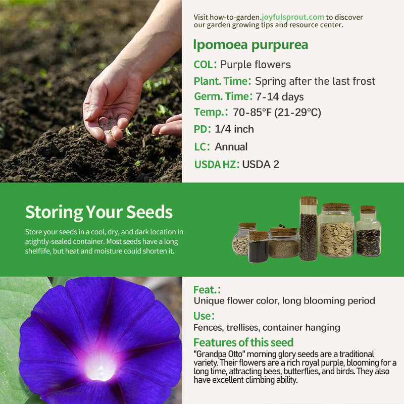 Once planted, "Grandpa Otto" morning glory seeds sprout vines with broad, heart-shaped green leaves and a rapid growth rate. From early summer to early autumn, they produce a continuous display of trumpet-shaped flowers with rich royal purple petals, creating a striking effect. Not only are their flowers visually appealing, they also attract bees, butterflies, and hummingbirds, adding vibrant life to your garden. Whether you let them climb garden arches, trellises, or simply let them spread across the ground as a groundcover, they offer a unique charm and require little pruning.