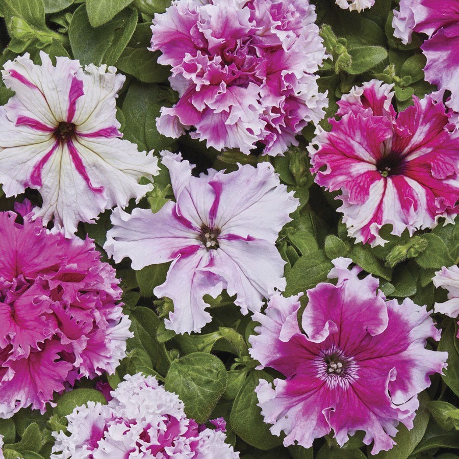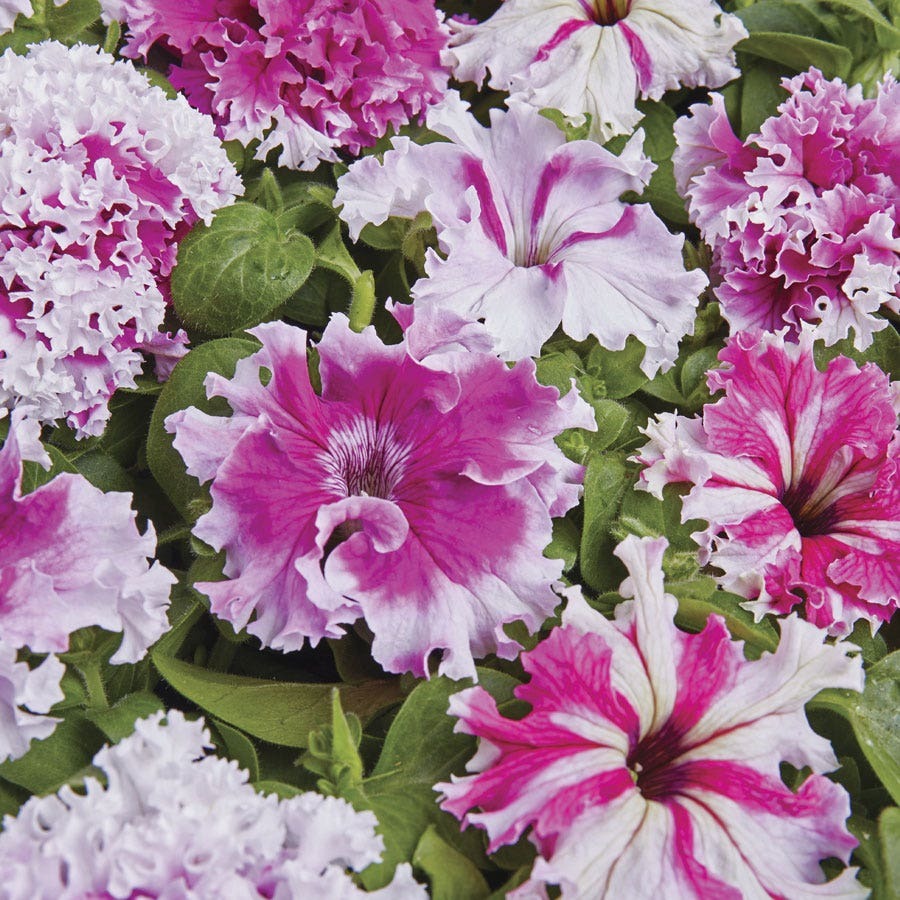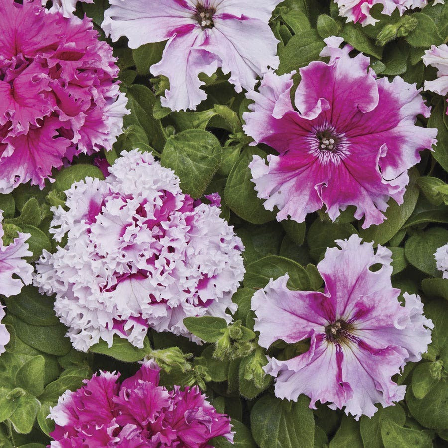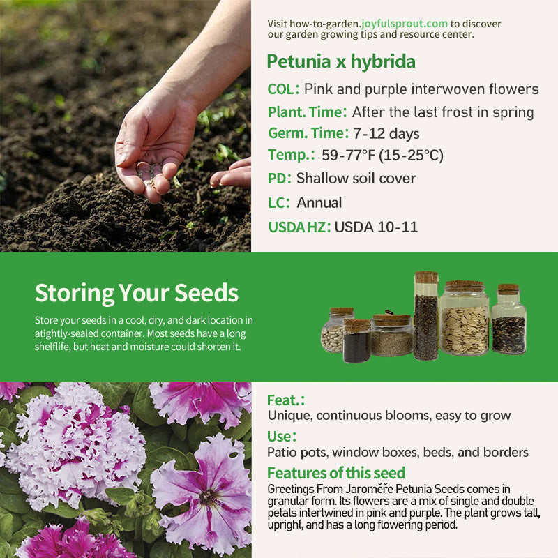 Greetings From Jaroměře Petunia Seeds is a petunia of the grandiflora fimbriata variety, named for the town in the Czech Republic where it was created. It is a perennial (USDA zones 10-11) that is not cold-tolerant and is often grown as an annual. Its flowers, with their ruffled pink and purple intertwined petals, bloom continuously until the first frost. The plant has a tall, upright, mound-like shape, making it suitable for patio pots, window boxes, beds, and borders.
