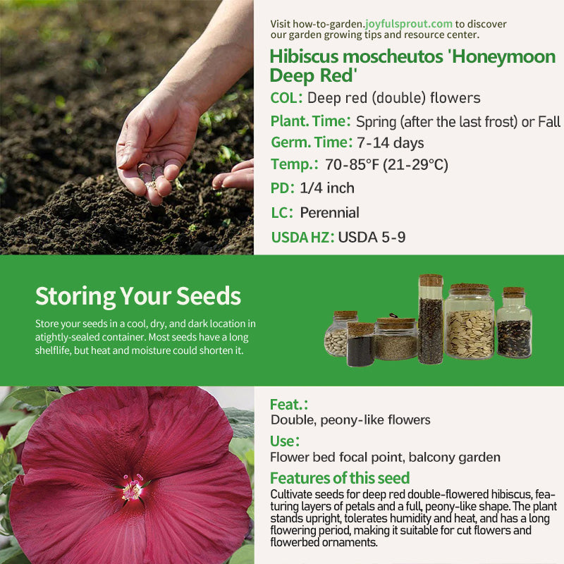 Honeymoon Deep Red Hibiscus Seeds specialize in double-flowered hibiscus. From sowing, the resulting perennial hibiscus boasts rich crimson flowers with over 20 petals, each approximately 7 inches in diameter, and full, miniature peony-like blooms. The plant grows upright, reaching a height of 30-36 inches. Its lush green leaves contrast strikingly with the crimson blooms, ensuring a long viewing period (summer through autumn). This variety is exceptionally tolerant of humidity and heat, maintaining its upright blooms in high summer temperatures and humidity. As a premium cut flower, cut flowers can be vase-stored for 7-10 days, making it suitable for both home and commercial cut flower arrangements. Whether used as a focal point in a flowerbed or as a decorative ornamental plant, its unique double-flowered shape ensures it stands out from the crowd.