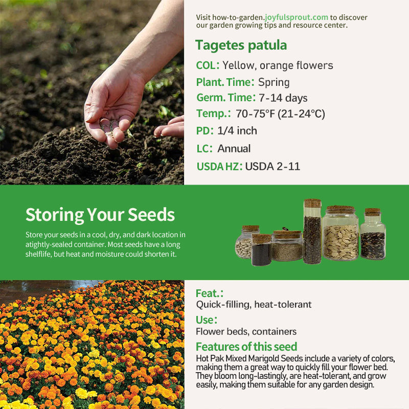 Hot Pak Mixed Marigold Seeds is a diverse assortment of marigold seeds, including a variety of colors like yellow and orange, perfect for quickly filling your flower bed. These fast-growing plants are heat-tolerant and thrive in full sun. Their long blooming period, from summer to fall, adds a vibrant color to your garden. They require only moderate moisture during planting and are easy to care for, making them an ideal choice for any garden design.