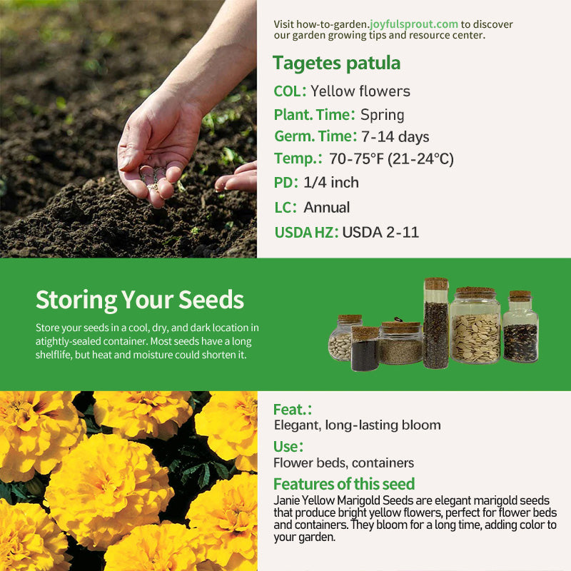 Janie Yellow Marigold Seeds are elegant marigold seeds that produce bright yellow flowers, perfect for flower beds and containers. These fast-growing plants are heat-tolerant and thrive in full sun. Their long blooming period, from summer to fall, adds color and vitality to any garden. Not only are Janie Yellow marigolds beautiful, they also attract bees and butterflies, contributing to a healthy environment. They are easy to care for, requiring only adequate water and sunlight, making them an ideal gardening choice.