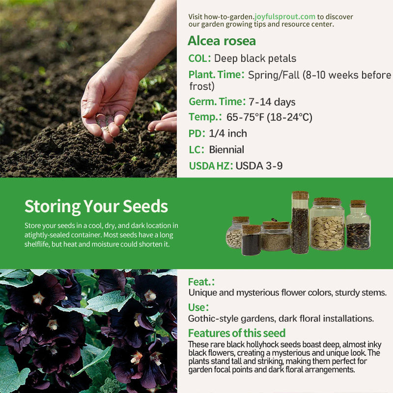 Jet Black Hollyhock Seeds are the "mysterious black pearls" of the horticultural world. After sowing, the deep black flowers gradually reveal themselves as they grow—first blooming with a dark purple hue, then fully blossoming to resemble a jade sculpture. The petals are thick, lustrous, and velvety in texture. The sturdy, straight stems, growing up to 6-7 feet, create a striking contrast against the deep green foliage, making them a striking dark centerpiece in any garden. Blooming in summer, each plant produces a small but exquisite bloom, each imbued with a mysterious aura. Perfect for adorning gothic gardens, dark floral arrangements, or pairing with silver plants for a striking visual impact, this hollyhock is the ideal choice for gardeners seeking unique character.