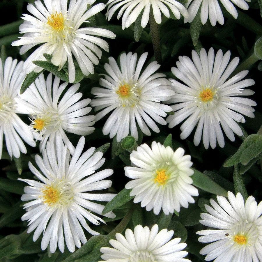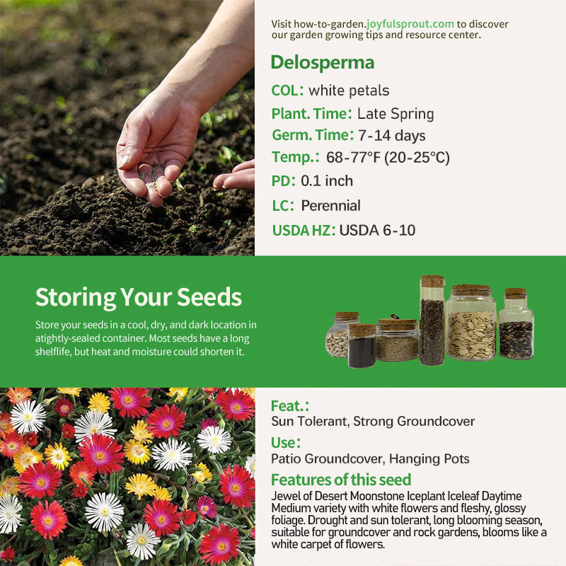 Jewel of Desert Moonstone is a premium variety of Iceplant (Iceleaf Sunburst) with a core highlight of "dense blooms".The flowers are white, with light, gauzy, moonstone-like petals that cover the entire plant in full bloom like a white carpet on the ground; the leaves are green with a fine sheen that makes them ornamental even when flowerless. Plants are prostrate, only 3-4 inches tall, cover the ground quickly, are drought and sun tolerant, and bloom more profusely in the summer heat, from late spring to early fall. Ideal for patio groundcover, rock garden slopes, or potted and hung for hanging landscapes, it requires little care and attention to reap the benefits of "full bloom".