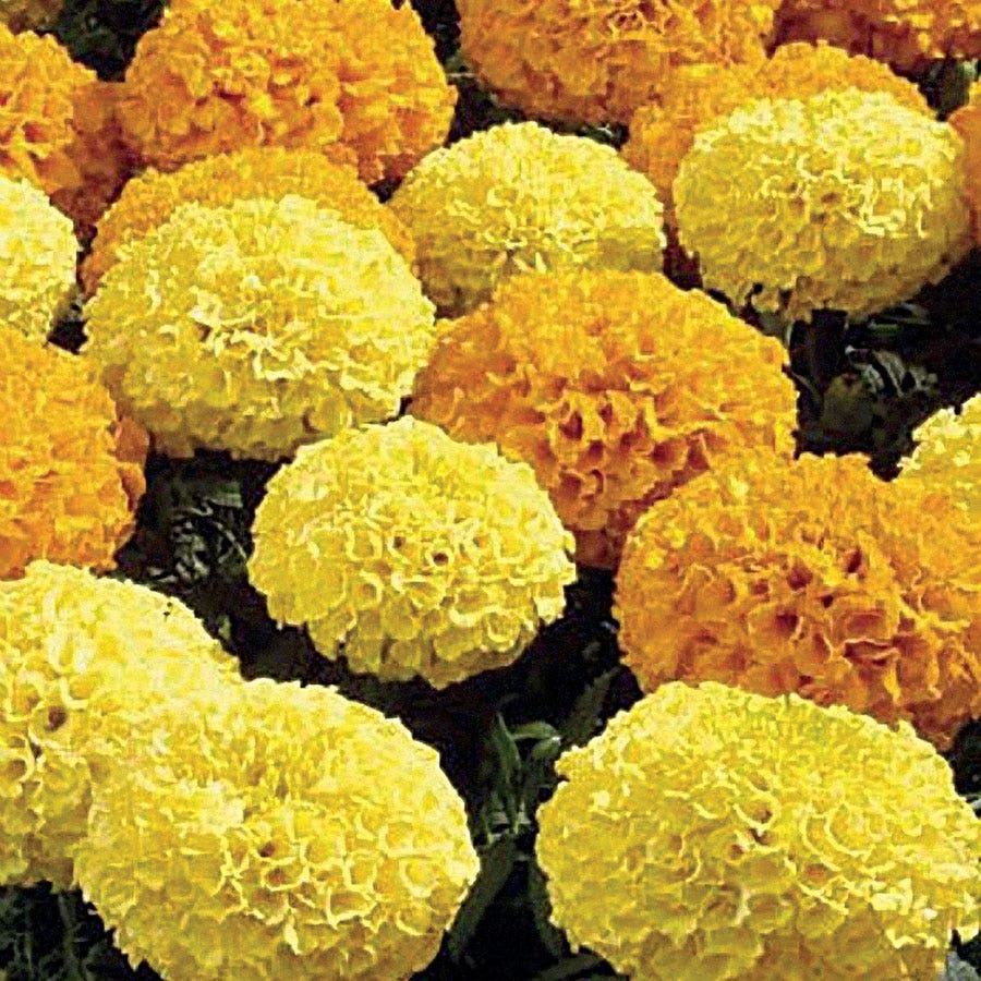 Disco Mix is a French marigold variety. It has a compact, well-branched plant, presenting a regular, lush appearance. Its flowers are 2 inches in diameter and come in a wide variety of colors, including yellow and orange. This variety blooms early, the first among marigold varieties, and produces large quantities of flowers, which continue to bloom throughout the summer. Its highly consistent habit and flowering time make it a striking effect whether planted alone to create a solid color strip or mixed with other flowers. It is suitable for planting in flower beds, borders, and containers, such as window boxes.