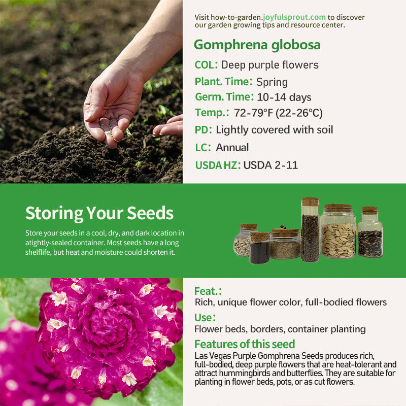 Las Vegas Purple Gomphrena Seeds produces striking flowers. Its flowers are approximately one-inch in diameter, spherical and full, with rich, inky purple bracts dotted with small white petals. The unique coloration makes it highly ornamental. This variety tolerates heat, humidity, and pests, performing exceptionally well in hot summers and has been certified as a "heat-tolerant plant" by the Dallas Arboretum and Botanical Garden. Flowering typically takes less than three months from sowing, spanning early to late summer. It prefers full sun and is not picky about soil, though it requires well-drained, fertile garden soil or potting soil. It is suitable for use in flower beds and borders and also makes excellent cut and dried flowers. It attracts butterflies and hummingbirds, adding vibrant beauty to any garden.