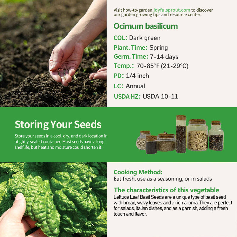 In a sunny garden, Lettuce Leaf Basil Seeds quietly sprout, producing broad, wavy leaves and an enticing aroma. This basil is popular for its distinctive appearance and rich flavor, making it especially suitable for fresh salads and Italian dishes. Imagine casually picking fresh Lettuce Leaf Basil while cooking and lightly sprinkling it on pasta or pizza, adding a refreshing touch and unique flavor to the dish. Lettuce Leaf Basil is rich in Vitamin K, Vitamin A, and various antioxidants, which help boost immunity and promote digestion. Whether used for flavoring or as a garnish, Lettuce Leaf Basil adds a healthy and delicious dimension to every dish, making every meal more vibrant.