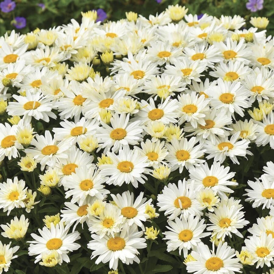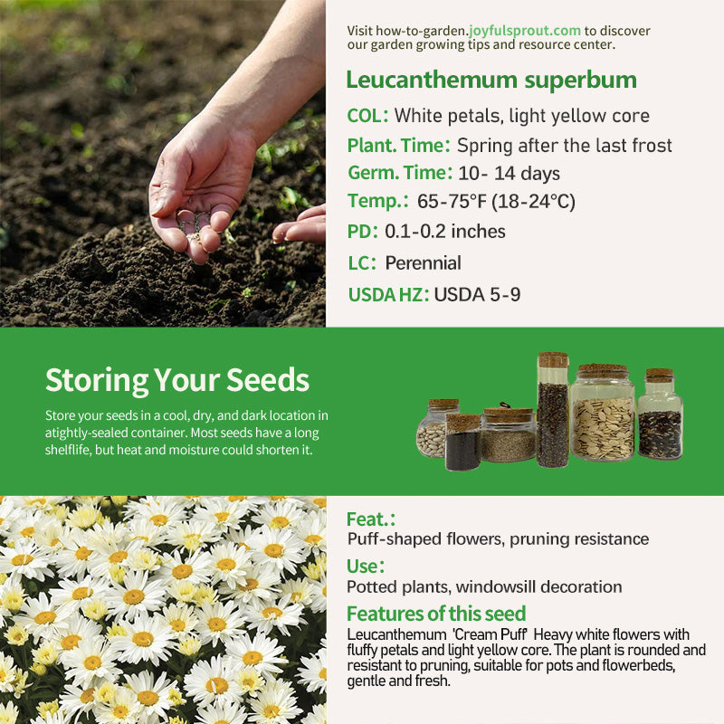 Leucanthemum 'Cream Puff' produces soft white flowers with heavy petals that are cascading and fluffy with a light yellow core for an overall fresh, healing style. Plants are 12-18 inches tall, rounded and compact, well-branched, densely flowered, pruning-resistant, and quick to re-bloom after pruning. It is cold hardy to USDA zones 5-9, can be overwintered in the open ground, and has loose soil requirements. Ideal for potting on windowsills, table tops, or as edging plants in flower beds, it injects a gentle flavor into small spaces, making it an ideal choice for gardening enthusiasts.