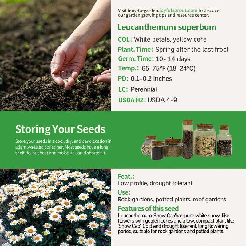 Leucanthemum 'Snow Cap'is a low, compact example of a shore daisy. Plants are only 8-10 inches tall and have a rounded'snow cap'shape that doesn't take up much space. The flowers are a standard form, with pure white ligule petals surrounding a golden yellow core, and measure about 2.5-3 inches in diameter. The flowers are abundant and cover the surface of the plant uniformly, creating a "snow-covered"visual effect. It can be overwintered in the open; it is also drought tolerant and will grow well under mild water stress. Flowering lasts from early summer to early fall and is suitable for planting in rock garden crevices, along the edges of flower beds, or in small pots.