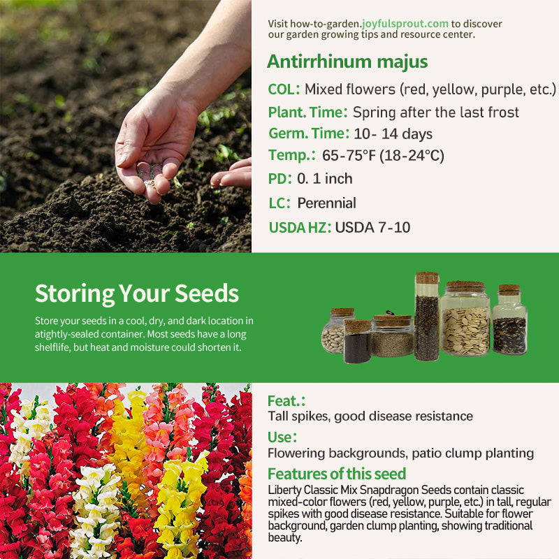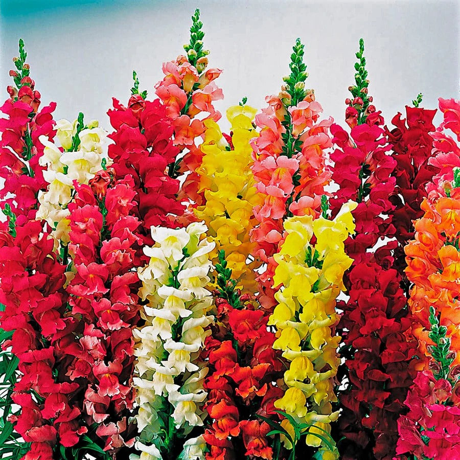 Liberty Classic Mix Snapdragon is a traditional classic, with red, yellow, purple, etc. The flower spikes are tall and regular, and the flowers are closely arranged, showing the vigorous vitality of traditional goldfish grass. Tough, disease-resistant plants with rich green glossy foliage are hardy to USDA zones 7-10, blooming in early spring and flowering well into fall. Suitable for use as a background plant for flower borders, or planted in clusters to form a classic flower wall in the yard, cut flower spikes and inserted into bottles, which can add a vintage aesthetic to the interior, and it is a must-have seed for gardening enthusiasts, and it can burst into bloom with rough management.