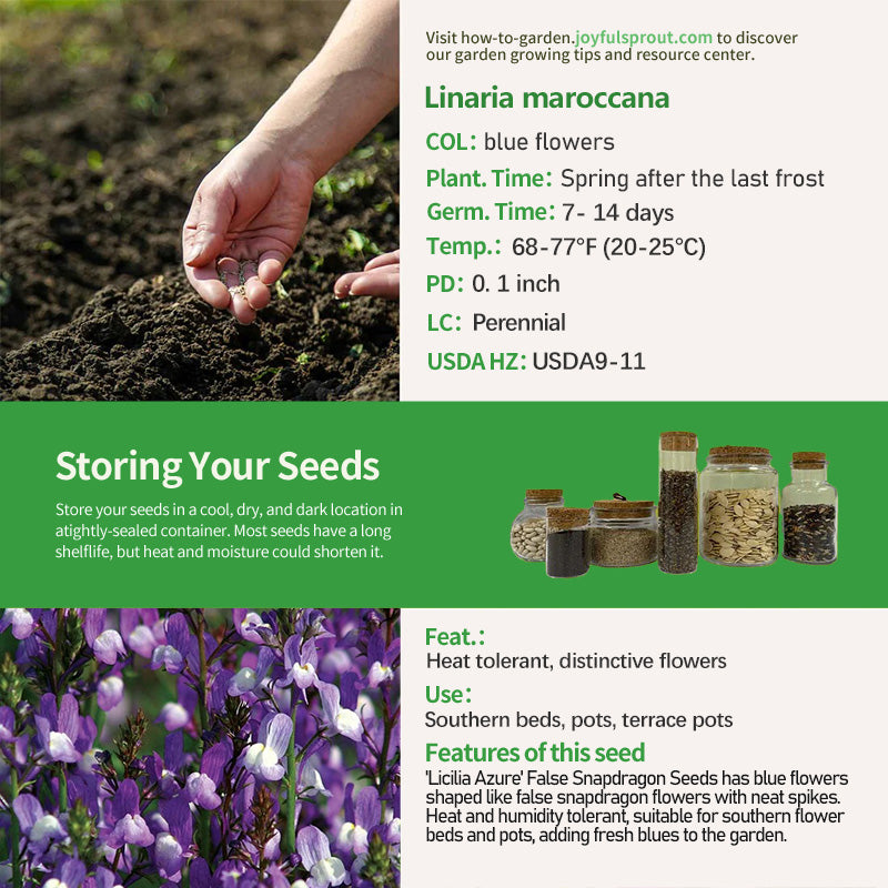 'Licilia Azure' False Snapdragon Seeds grows plants with fresh blue flowers that resemble (and are often misidentified as) goldfishers, with neat, elongated spikes of densely arranged blue flowers like "blue swords". Plants are 18-24 inches tall, with bright green lance-shaped foliage, outstanding heat and humidity tolerance, and performs well when grown in hot, rainy areas of the South. Flowering lasts from early summer to early fall, with a steady flow of flowers, suitable for planting in southern flower beds and pots, adding cool blues to the garden!