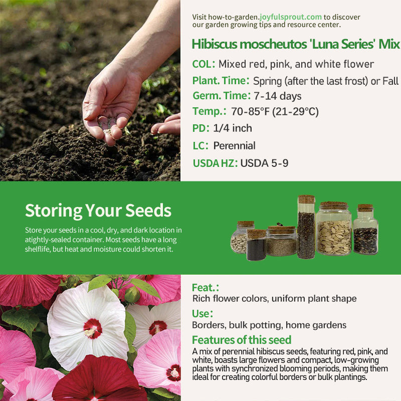 Luna Mix Hibiscus Seeds is a cost-effective mix of hibiscus seeds, featuring a selection of classic red, pink, and white flower colors, ensuring vibrant, colorful perennials. All varieties maintain the Luna series' compact characteristics, reaching a uniform height of 24-30 inches, ensuring a uniform plant shape and no need for additional proportioning. The flowers are large (7-8 inches), with thick, firm petals and vibrant, long-lasting colors. Blooming synchronously (summer through fall), the blooms create a vibrant, vibrant sea of color throughout the border. This versatile mix is highly compatible, ensuring a vibrant, vibrant landscape for both small home gardens and commercial landscape projects. It is easy to maintain, tolerant of humidity and heat, and highly resistant to pests and diseases.