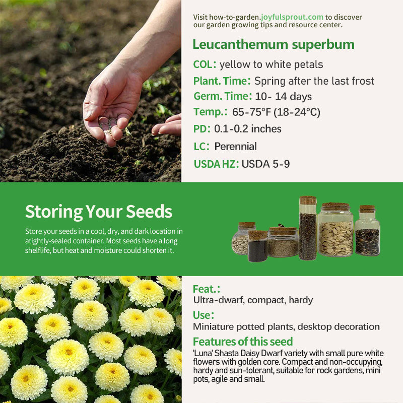 'Luna' Shasta Daisy is a dwarf variety designed for "small spaces", standing only 8-12 inches tall with a compact, rounded shape that doesn't take up much space. The flowers are miniature, single-petaled, with pure white ligule petals and a small, golden core that is as soft as moonlight, and are densely packed in clusters among the foliage. It is cold and sun hardy and can overwinter in the open in USDA zones 5-9, with no need for summer shade. Flowering lasts from late spring to late summer, suitable for planting in rock garden gaps to fill in the blanks, or potted plants placed on the desktop, window sill, for indoor and outdoor small space to add natural vitality, maintenance is simple and easy to get started.