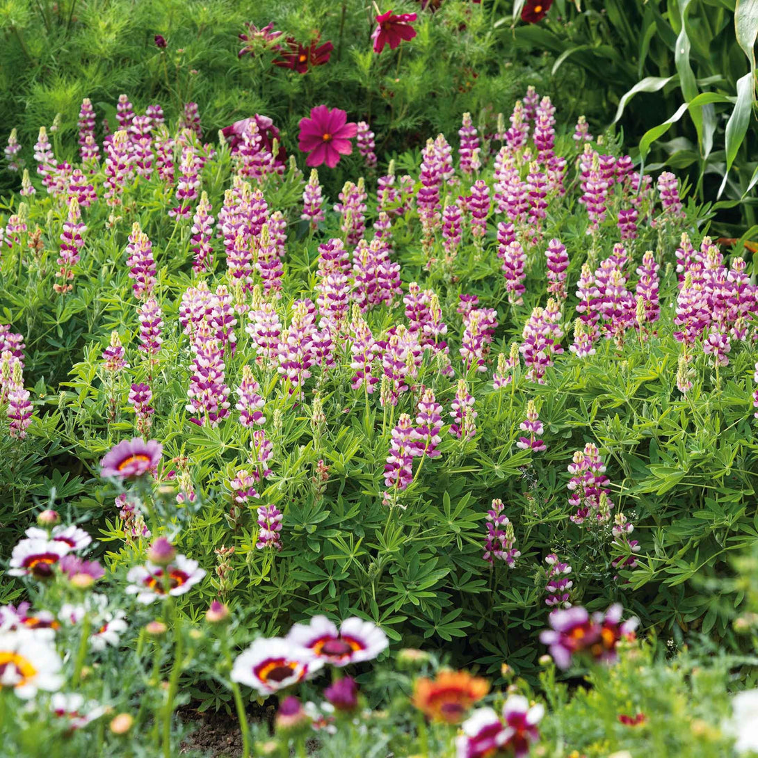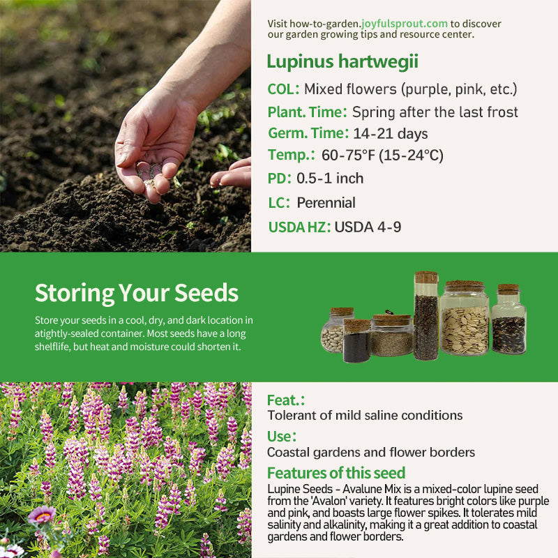 Lupine Seeds - Avalune Mix boasts a combination of salinity and alkalinity tolerance and vibrant colors. The flower spikes are large and full, approximately 16-22 inches long, and when in full bloom, they create a vibrant, visually striking image. Its mild salinity and alkalinity tolerance allows it to withstand the effects of soil salinization brought on by sea breezes, ensuring stable growth. Plants grown from seed develop a robust, approximately 24-30 inches in height, with sturdy stems that resist lodging. It's suitable for centerpieces in flower borders or for large, swathes of land to create a vibrant sea of flowers. Lupine requires high light levels, requiring at least 6 hours of sunlight daily. It prefers loose, airy, sandy soil. Regular fertilization is not necessary, requiring only regular watering.