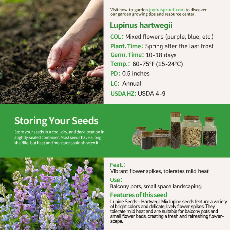 Lupine Seeds - Hartwegii Mix (Hartwegii Mix) is characterized by its vibrant, light colors, including purple and blue. Its flower spikes are slender, approximately 8-12 inches long, and when in bloom, they resemble "colorful feathers," creating a fresh, soft flowerscape. This variety tolerates mild heat better than other lupines and can thrive in summer temperatures up to 30°C, making it suitable for parts of the South or for balcony pots. Mature plants reach a compact height of approximately 12-16 inches, requiring no extra space and are suitable for small balcony pots, small garden beds, or combined flower boxes. It has low soil requirements; ordinary garden soil with a small amount of leaf mold will suffice. Daily care requires ample sunlight and moderate watering, avoiding standing water.