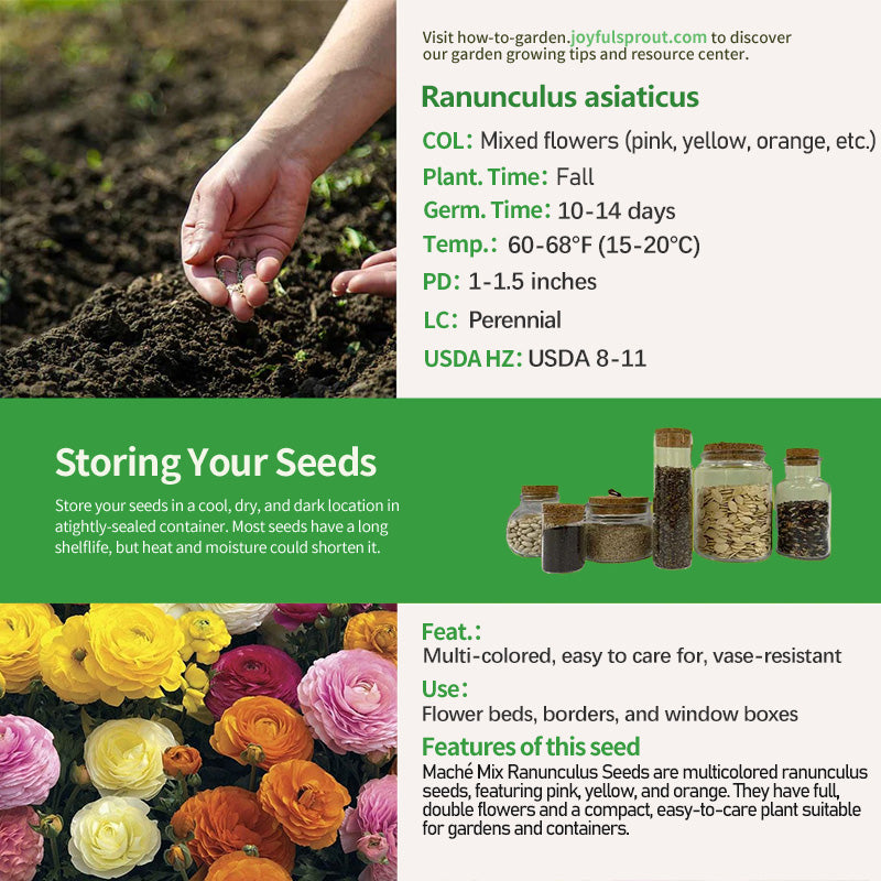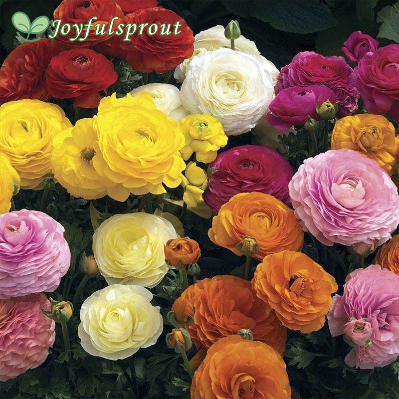 Maché Mix Ranunculus Seeds is a classic multicolored ranunculus combination, featuring saturated hues of pink, yellow, and orange, offering a comprehensive color palette suitable for diverse landscape applications. The flowers are full, double, with numerous, evenly arranged petals, measuring approximately 2.5-3.5 inches in diameter. When in bloom, they resemble "mini-peonies," with some flowers having a subtle sheen that enhances their beauty in sunlight. The plants grow approximately 10-16 inches tall, forming a compact, clumping plant. The palmately divided leaves create a striking contrast between the vibrant colors and the vibrant green. They prefer a cool, dry environment and avoid high temperatures and humidity. The ideal germination temperature is 15-18°C. The flowering period lasts from early spring to early summer, with up to 5-8 flowers per plant. The seeds germinate easily and are easy to care for, making them suitable for beginners.Special Offers: