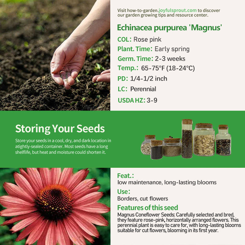 An experienced gardener, while tidying his garden, decided to try growing Magnus Coneflower Seeds. He planted the seeds according to the instructions, and they germinated quickly. As the plant grew, rose-purple flowers gradually appeared, arranged in a unique horizontal pattern. The first year, the flowers were few but striking. In the second and third years, the number of flowers increased, and the plant flourished. The gardener used these flowers as cut flowers and to decorate his home. Magnus Coneflower Seeds have added much joy to his gardening life.