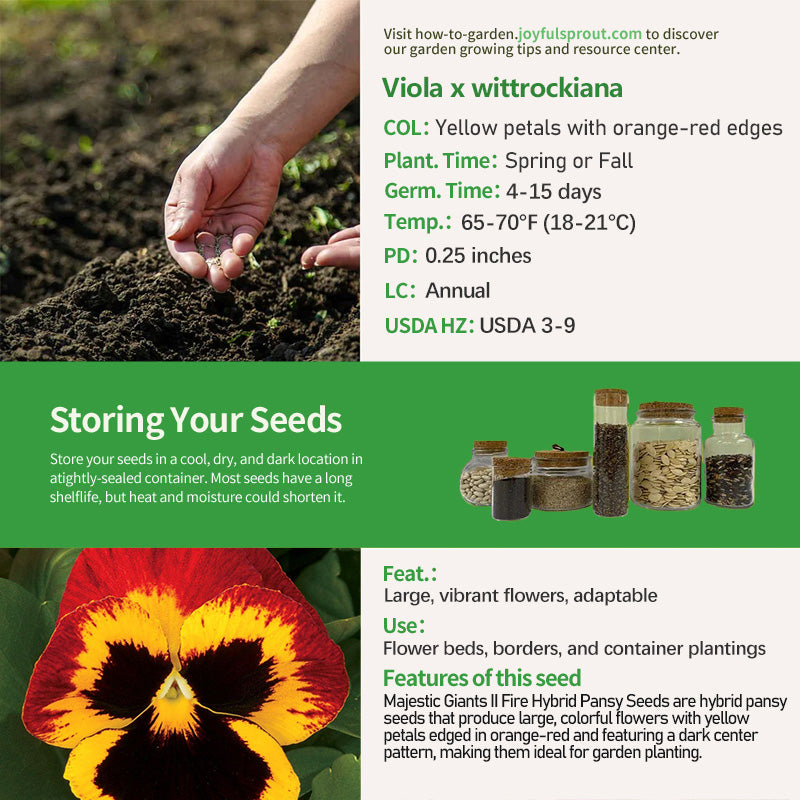 Majestic Giants II Fire Hybrid Pansy Seeds produce plants that are compact, ranging in height from 6 to 10 inches. The flowers are large, 3 to 4 inches in diameter, with yellow petals edged in orange-red and featuring a dark center pattern. They prefer full sun but can tolerate some shade. They are not picky about soil, but thrive best in fertile, well-drained soil. They can be planted prominently in the garden, complementing other flowers to create a vibrant, vibrant accent. They are also suitable for potted plants on balconies, patios, and other areas.