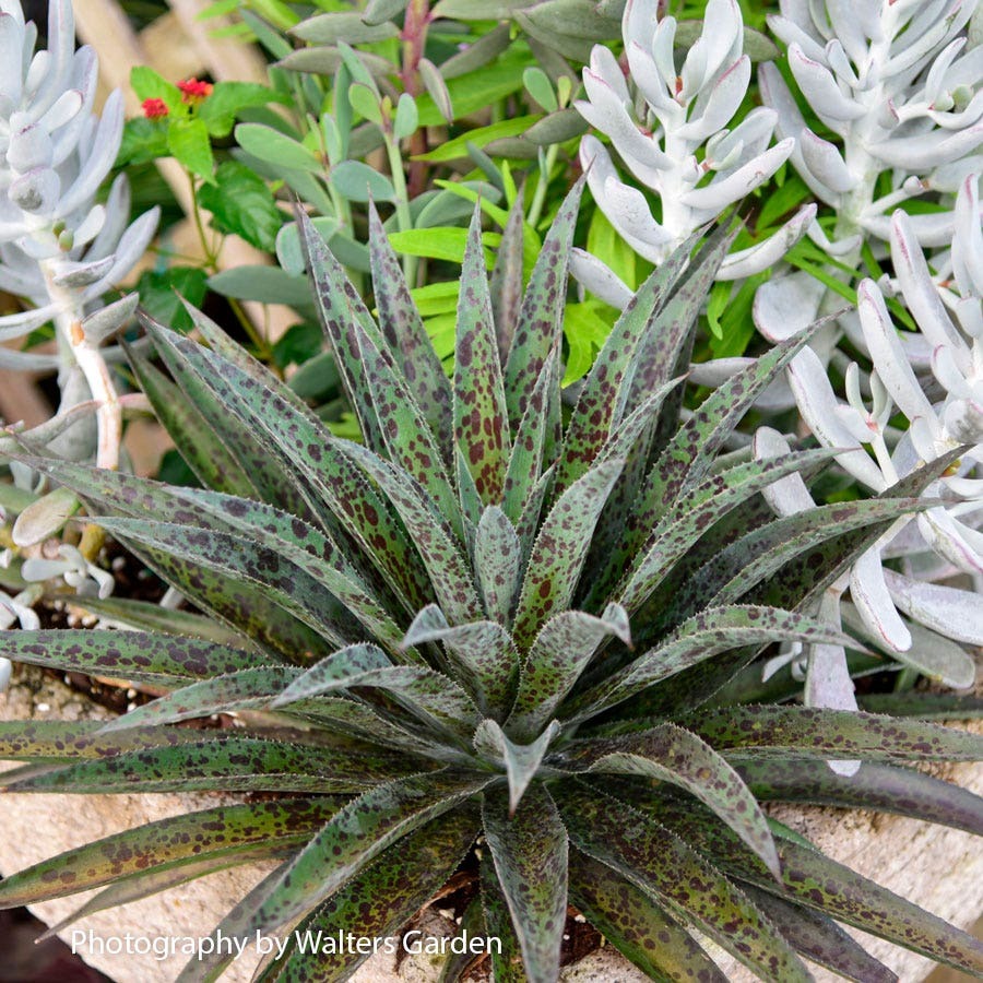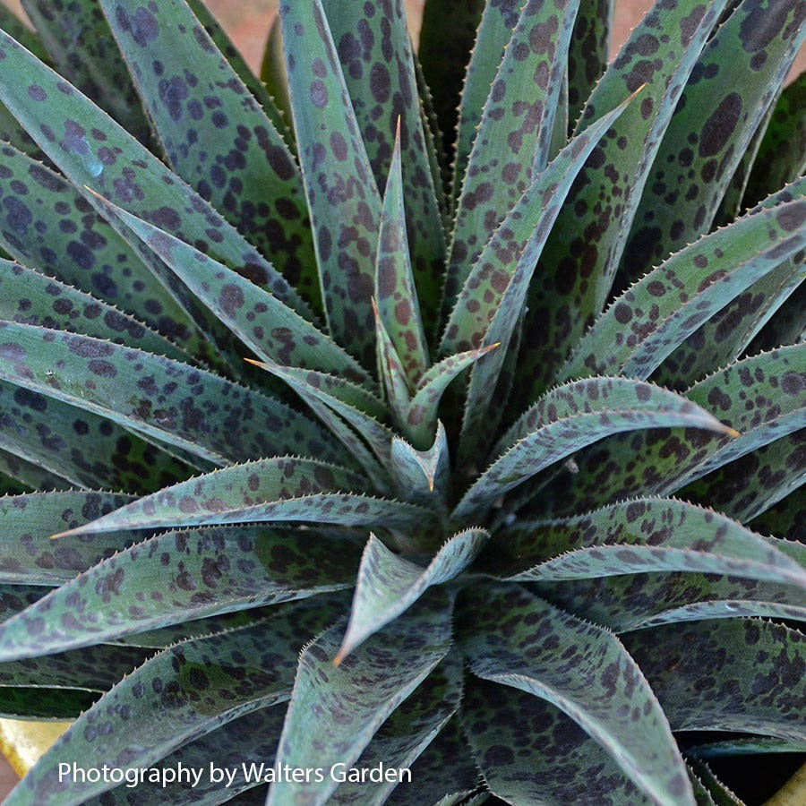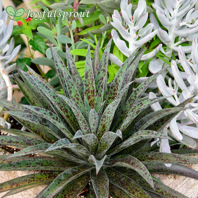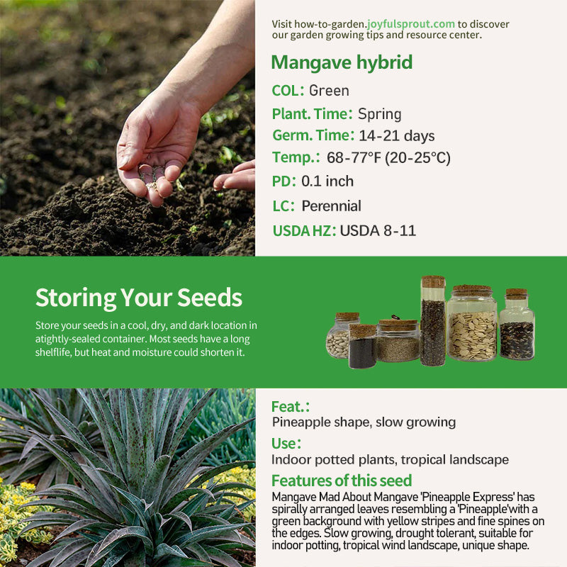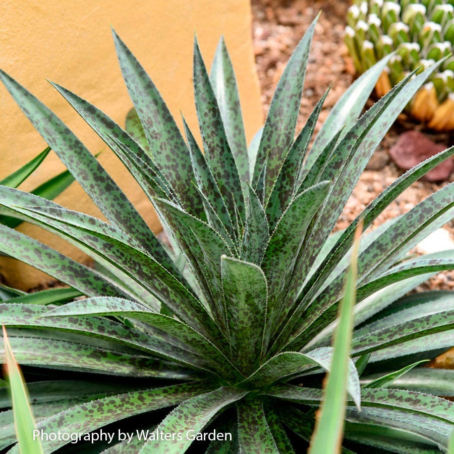 Mangave 'Pineapple Express' grows with leaves spirally arranged from the center outward, resembling a ripe pineapple, with dark green leaves covered with irregular yellowish longitudinal stripes, and leaf edges with fine translucent spines, and the overall style is tropical and cute. Plants are slow-growing, with mature plants measuring about 12-16 inches in diameter, and do not require frequent pruning. It is drought tolerant, but over-watering makes it susceptible to root rot. It is suitable for planting in airy clay pots, indoors on a balcony or tropical patio, where it can grow in diffused light without the need for direct sunlight, and can maintain its pineapple-like shape for a long time for lasting ornamental appeal.