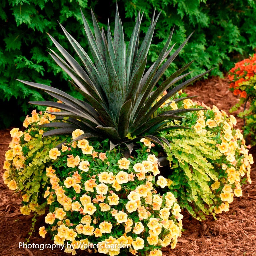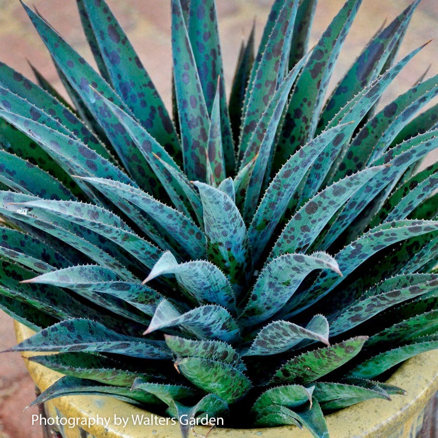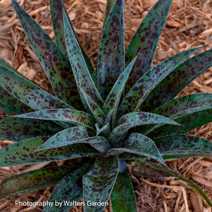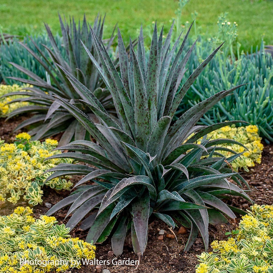 Mangave 'Pineapple Express' grows with leaves spirally arranged from the center outward, resembling a ripe pineapple, with dark green leaves covered with irregular yellowish longitudinal stripes, and leaf edges with fine translucent spines, and the overall style is tropical and cute. Plants are slow-growing, with mature plants measuring about 12-16 inches in diameter, and do not require frequent pruning. It is drought tolerant, but over-watering makes it susceptible to root rot. It is suitable for planting in airy clay pots, indoors on a balcony or tropical patio, where it can grow in diffused light without the need for direct sunlight, and can maintain its pineapple-like shape for a long time for lasting ornamental appeal.