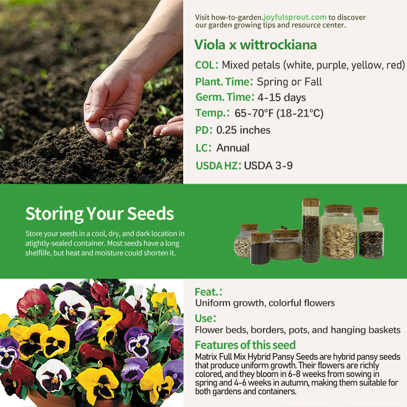 Plants grown from Matrix Full Mix Hybrid Pansy seeds exhibit excellent uniformity throughout their growth. They typically reach a compact height of 6-8 inches. Their narrow, dark green leaves add a vibrant touch. Their flowers are vibrant and vibrant, ranging from purple, yellow, white, and red. The flowers are approximately 2-3 inches in diameter, often with distinctive veining or spots in the center of the petals, adding depth and visual appeal. From sowing to blooming, they take 6-8 weeks in spring and 4-6 weeks in autumn. Whether planted in garden beds or borders, or used in decorative pots or hanging baskets, these pansy flowers create a vibrant and vibrant landscape.
