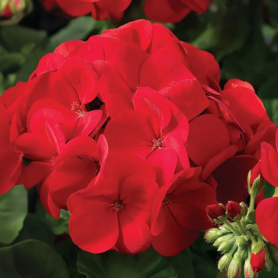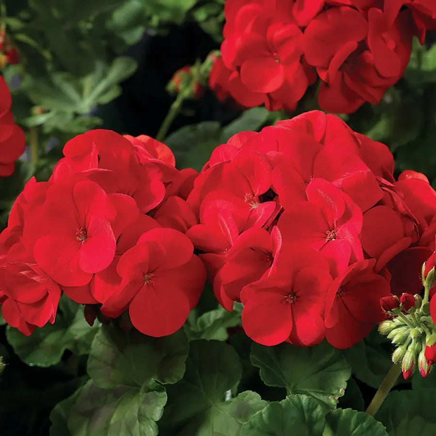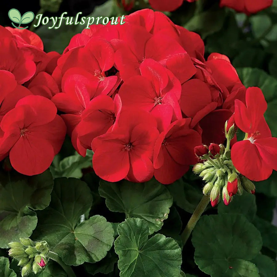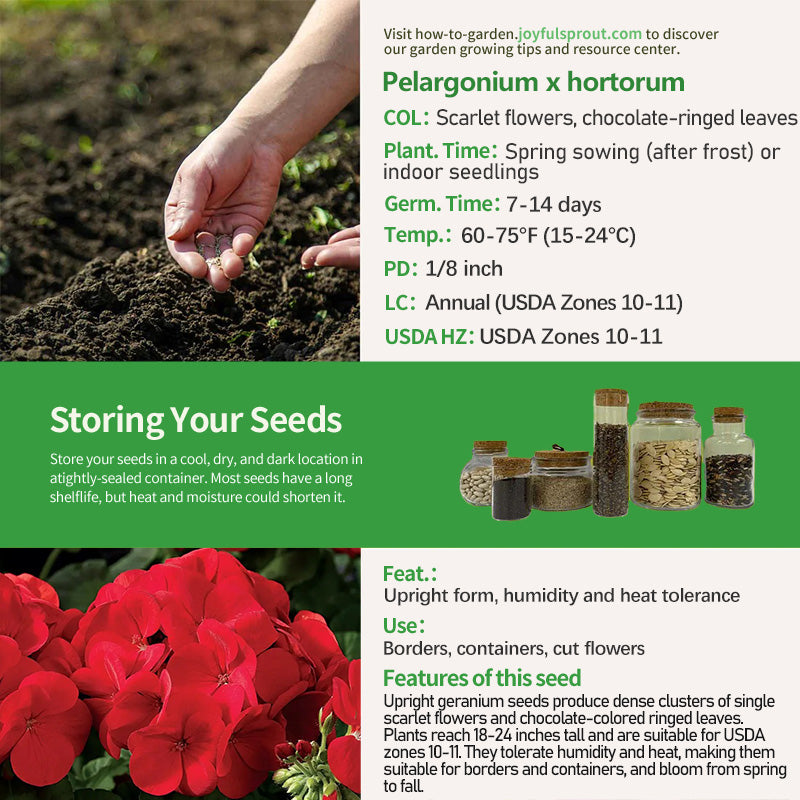 Upright geranium seeds produce plants 18-24 inches tall with clusters of single, slightly wrinkled scarlet flowers and dark green leaves ringed in a chocolate-colored horseshoe pattern. They are perennials in USDA zones 10-11, preferring full sun and organic-rich soil. They tolerate hot and humid weather, but rain does not affect flowering. Germination occurs 7-14 days after sowing (at 70°F). Cover with 1/8 inch of soil and prune regularly to promote branching. The sturdy stems resist lodging, making them suitable for mid-borders or large containers. They create a vibrant color combination with yellow marigolds, and bloom from spring to late fall.