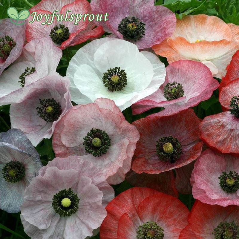 'Mother of Pearl' poppy seeds produce stunning plants. Their petals feature a rich variety of colors, including pale orange, lavender, and white. Each flower resembles a watercolor painting meticulously crafted by nature, with soft, seamless transitions between tones. Petals may feature matching color spots or delicate borders. The flowers, measuring 3-4 inches in diameter, borne on upright, 2-foot-tall stems topped with feathery leaves, create a sleek, graceful plant. Their flowers shimmer in the sun and sway gently in the breeze, creating a dreamy atmosphere in the garden. They are also incredibly easy to grow; simply scatter the seeds for a beautiful harvest.